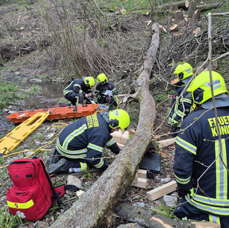 Zur schonenden Rettung wurde der umgestürzte Baum mittels Hebekissen angehoben und die Person befreit. Anschließend wurde die Person am Spinboard fixiert und zur sicheren Rettung in einer Korbschleiftrage gesichert. Mithilfe eines Flaschenzugsystems wurde die Korbschleiftrage für die weiteren Rettungsmaßnahmen zur Straße befördert.